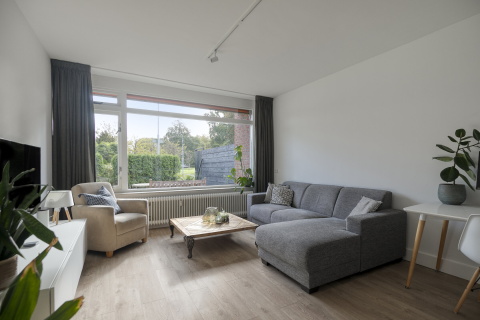 De lichte woonkamer heeft dankzij de grote raampartijen veel natuurlijk lichtinval. Via zowel een deur als een schuifdeur bereik je het balkon, dat ideaal gelegen is op het zuiden — perfect om het hele jaar door van de zon te genieten! Voor de schaduwliefhebbers is er een zonnescherm aanwezig.